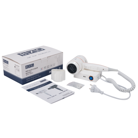BXG-1600Н1 –  Мощный надежный фен нового поколения с функцией Ионизации для сушки и укладки волос.  Предназначен для использования в номерных фондах гостиниц и отелей. Фен с настенным держателем для удобной и компактной фиксации. Выполнен из высокопрочного пластика ABS в благородном белом цвете.